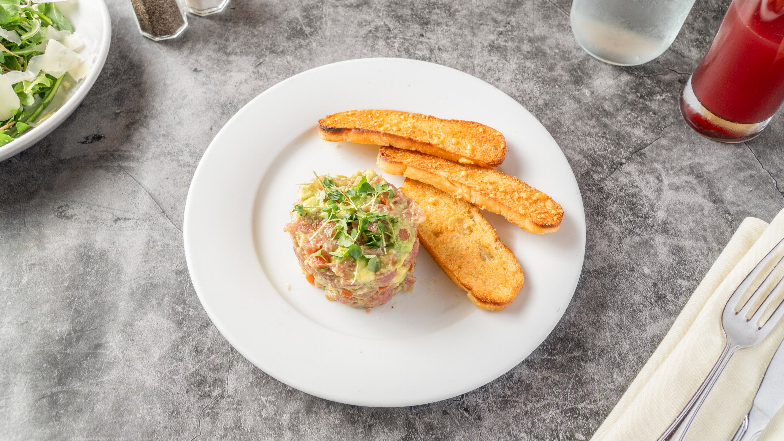 Fresh, sushi-grade ahi tuna finely diced and lightly tossed in a citrus-soy vinaigrette with avocado, shallots, and a hint of spice. Served with crisp crostini for a clean, flavorful bite that’s both refreshing and elegant.