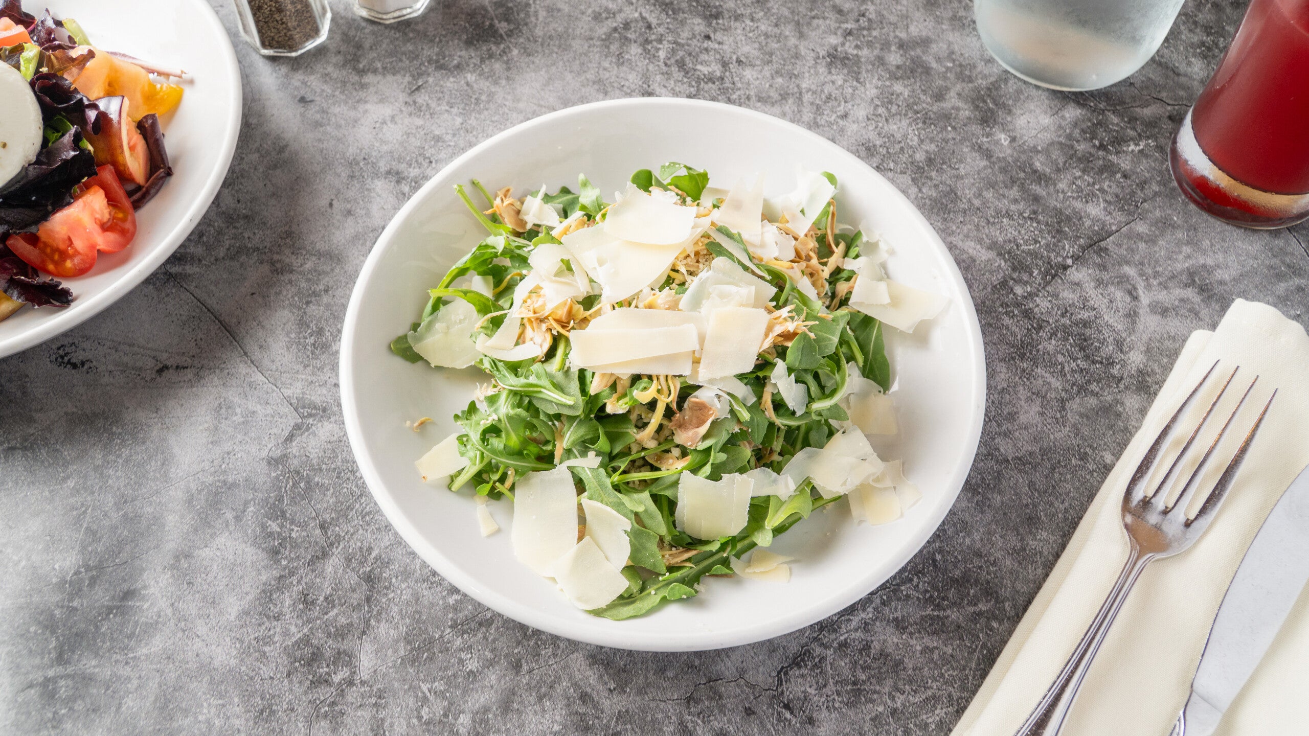 A fresh and vibrant salad of wild arugula, thinly sliced baby artichokes, shaved Parmigiano-Reggiano, and a drizzle of lemon vinaigrette. Light, peppery, and perfectly balanced with citrus and umami notes.